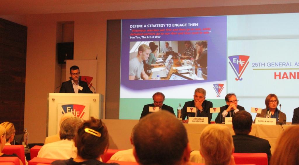 Sob o tema "Hands On", a AG foi um momento de debate e discussão de como podemos melhor a modalidade quantitiva e qualitativamente, nas suas diferentes variantes. Foi neste sentido que Marcos Castro, também membro do Comité de Comunicação da EHF e a convite da própria, realizou uma intervenção sobre a importância de um planeamento de marketing eficaz na realização de eventos, apresentando o projeto desenvolvido para a EHF alusivo à definição da estratégia a adotar pelos organizadores de torneios para potenciar o engagement com os media e com os fãs. Este documento encontra-se disponível em http://www.eurohockey.org